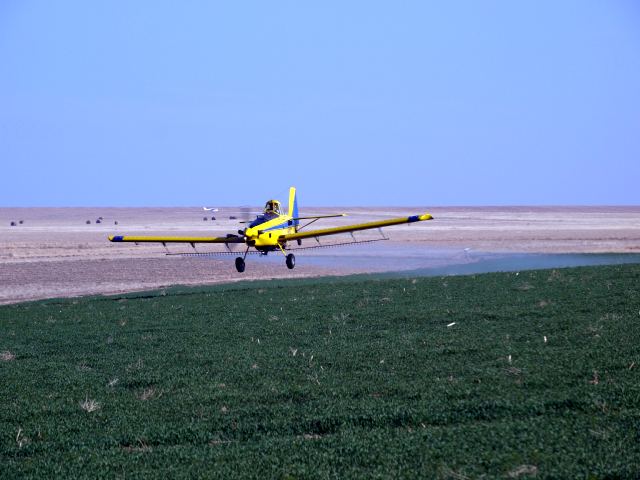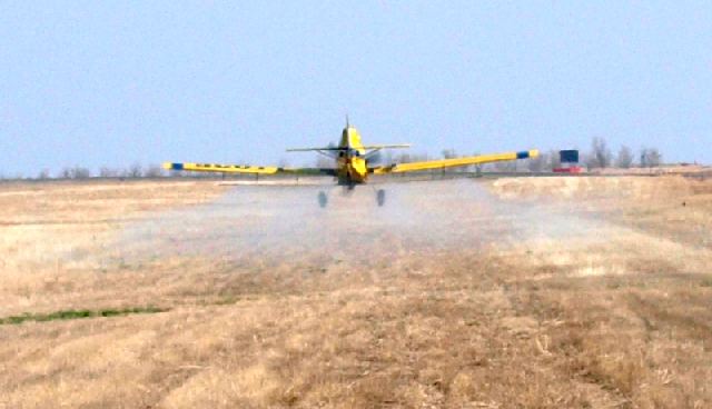 Photo 3 - The left boom is charged + positive + and the right boom is charged - negitive-. This causes the spray from the left boom to be attracted to the right boom and vice versa. There is a 6 foot gap under the belly (No Nozzels) yet by the time the spray lands on the crop the pattern is solid and even. Also notice no wing tip vortice influence and how soon the spray is attracted to the crop. |
